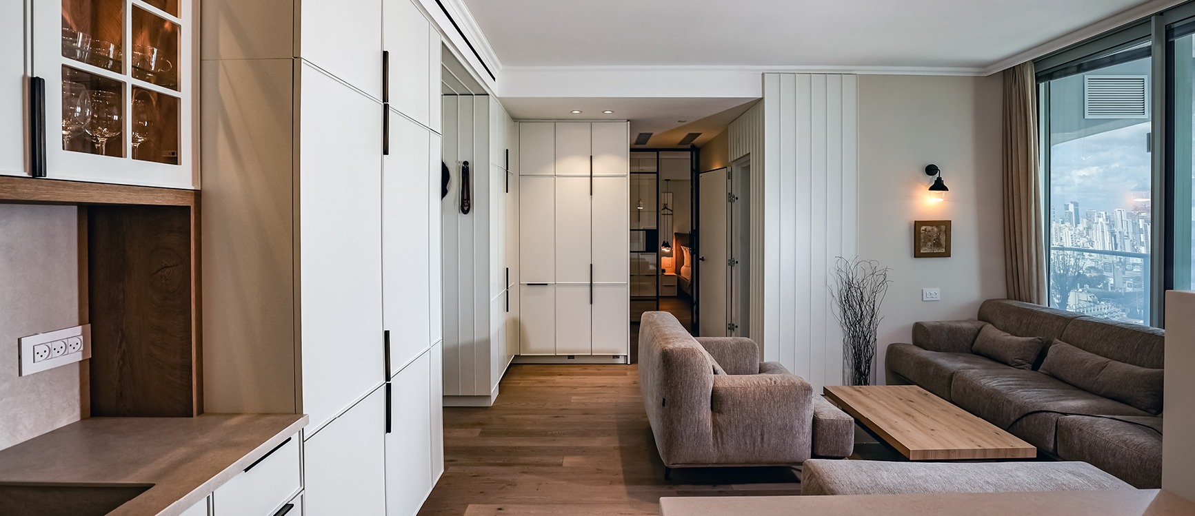 דירה במגדלי TLV בתל אביב. דירה קטנה במגדל עם נגרות היקפית בכל רחבי הדירה בסגנון כפרי מעודן. חדר השינה וחדר העבודה כוללים ארונות היקפיים על חלק ניכר מקירות הדירה אשר מאפשרים אחסון מלא גם בדירה הקטנה. הסגנון הכפרי ניכר בכל חלקי הנגרות, כולל חיפוי דלת הכניסה וכולל דלת קו אפס לשרותי אורחים.